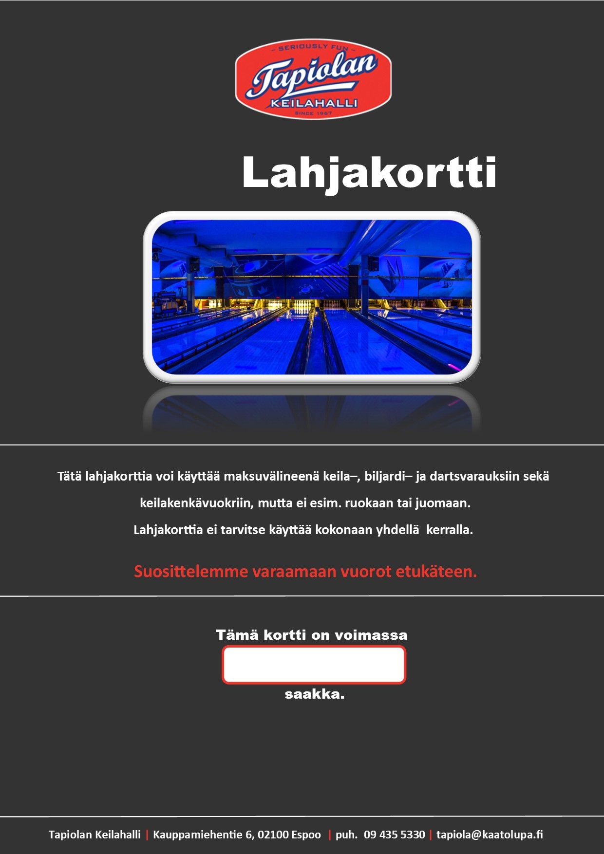 Voit valita mieleisesi summan lahjakortille (20-500 € välillä), ja lahjakortti toimitetaan heti suoraan sähköpostiisi tyylikkäänä PDF-tiedostona, jonka voit lähettää edelleen haluamallesi lahjakortin saajalle sähköisesti tai tulostaa paperille. Halutessasi voit ottaa lahjakortista kuvakaappauksen ja lähettää sen vaikkapa WhatsAppilla ystävällesi tai päivänsankarille, joka pääsee sitten nauttimaan keilahallimme tarjoamista elämyksistä.